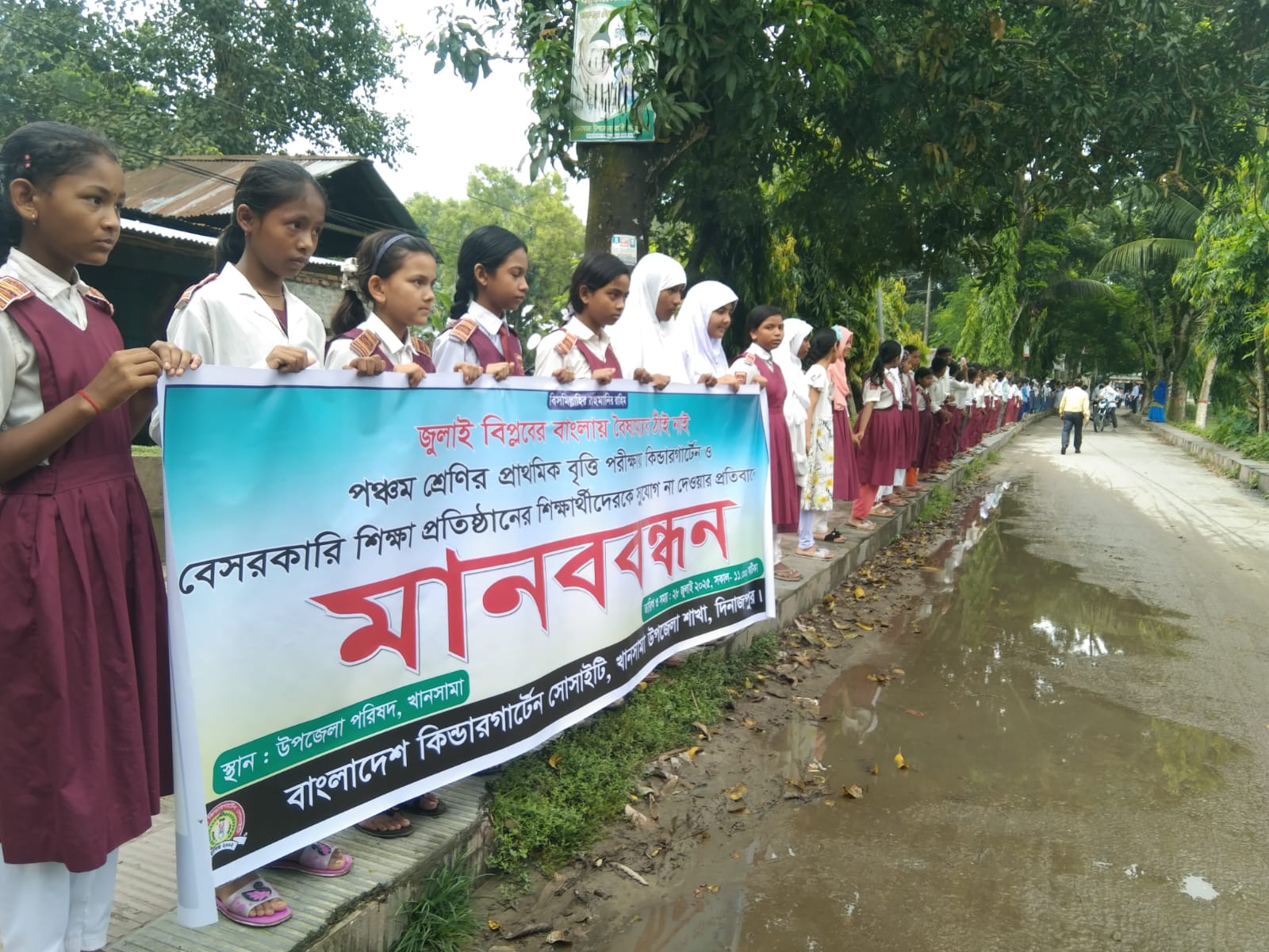 আজ (২৮ জুলাই) সোমবার সকালে সরকারি ভাবে প্রাথমিক বৃত্তি ২০২৫ পরীক্ষায় বৃত্তি কমিটির সিদ্ধান্ত মোতাবেক কিন্ডার গার্টেনে অধ্যায়নরত শিক্ষার্থীদের অংশগ্রহণ করতে দেওয়া হবে না। এ বিষয়টি চিঠি আকারে প্রকাশিত হওয়ার পর কোমলমতি শিক্ষার্থীদের মনে বিরূপ প্রতিক্রিয়া সৃষ্টি হয়। তারই ফলশ্রুতিতে খানসামা উপজেলা অন্তর্গত ২০ টি কিন্ডারগার্টেন এক যোগে সারা দেশের ন্যায় বাংলাদেশ কিন্ডারগার্টেন সোসাইটি খানসামা উপজেলা শাখা কর্তৃক সকাল ১১ টার সময় মানববন্ধন কর্মসূচি পালন করেন। মানববন্ধন শেষে বেলা ১২টার সময় উপজেলা নির্বাহী অফিসার বরাবর এবং শিক্ষা অফিসারকে একটি স্মারক লিপি প্রদান করা হয়।