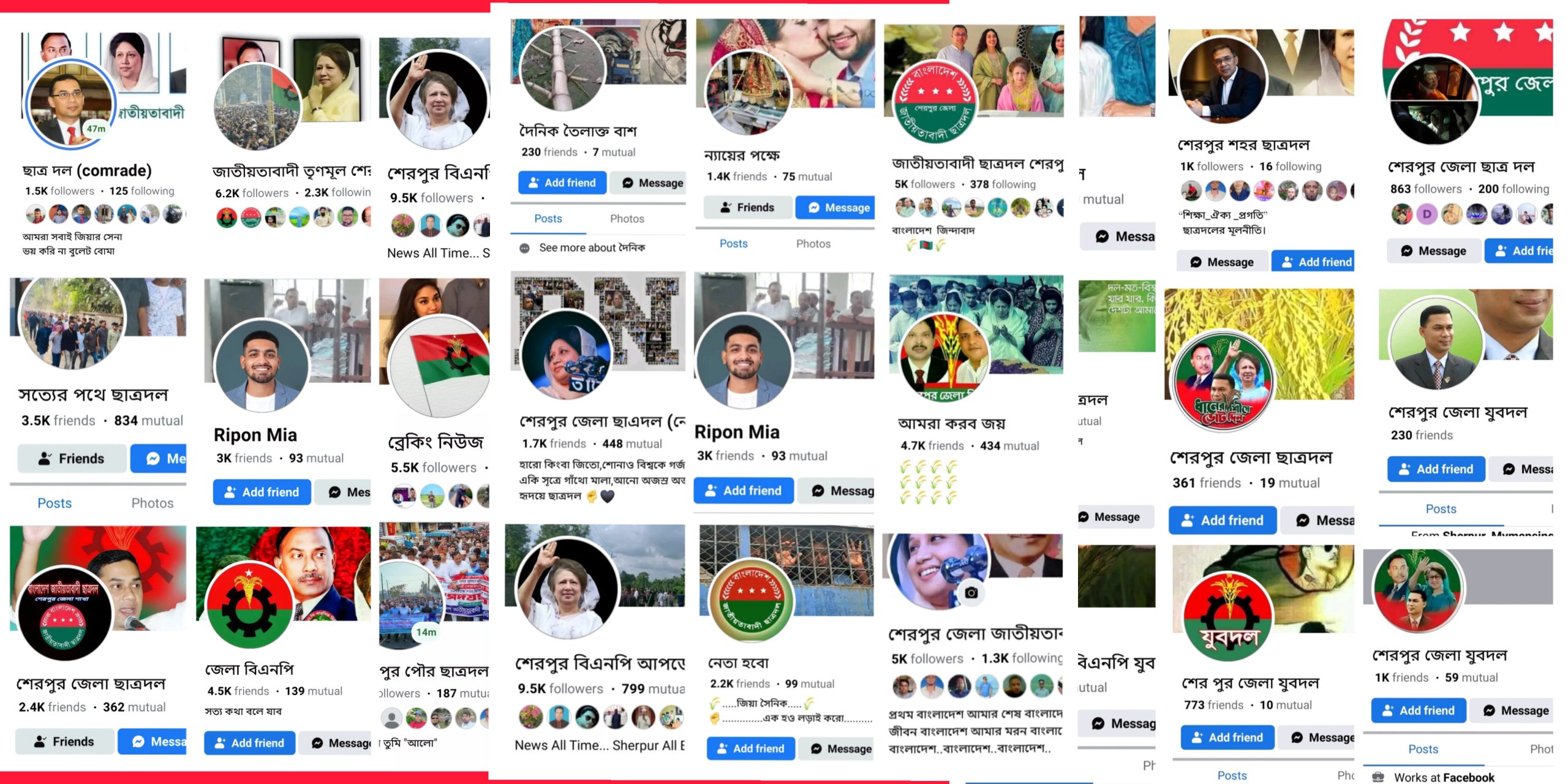 সম্প্রিতি শেরপুর জেলা বিএনপি, ছাত্রদল, যুবদল স্বেচ্ছাসেবক দল সহ সকল অঙ্গ ও সহযোগী সংগঠন এর নামে দের শতাধিকেরও বেশি ভূয়া ফেইসবুক আইডি দৃশ্যমান লক্ষ করা যায়।