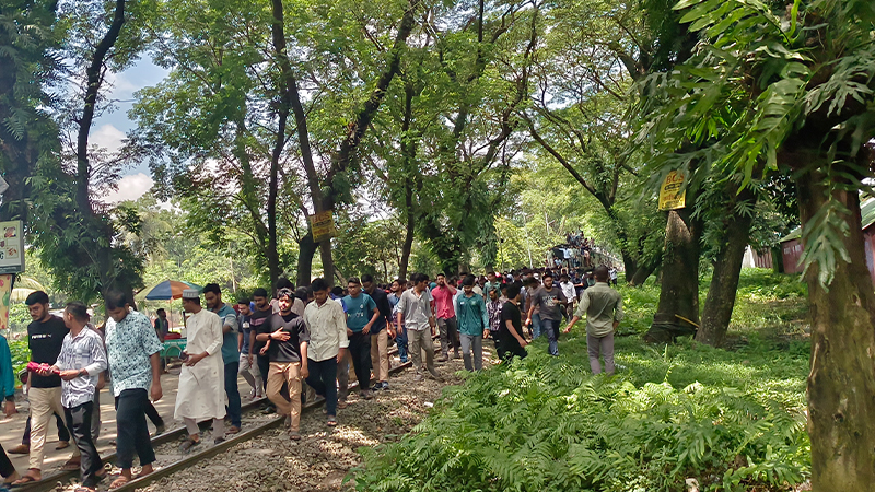 কৃষিবিদ ঐক্য পরিষদ ঘোষিত তিন দফা দাবি বাস্তবায়নে রেলপথ অবরোধ করে বিক্ষোভ করছেন বাংলাদেশ কৃষি বিশ্ববিদ্যালয়ের শিক্ষার্থীরা।