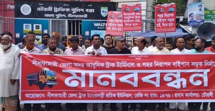 মোঃ মাসুদ রানা,স্টাফ রিপোর্টার : নীলফামারী সদরে আধুনিক ট্রাক টার্মিনাল ও শহর রক্ষায় নিরাপদ বাইপাস সড়ক নির্মাণের দাবিতে মানববন্ধন অনুষ্ঠিত হয়েছে। সোমবার (১৫ সেপ্টেম্বর) সকালে জেলা ট্রাক-ট্যাংকলড়ী শ্রমিক ইউনিয়নের আয়োজনে শহরের ব্যস্ততম চৌরঙ্গী মোড়ে ঘন্টাব্যাপী এ মানববন্ধন অনুষ্ঠিত হয়।