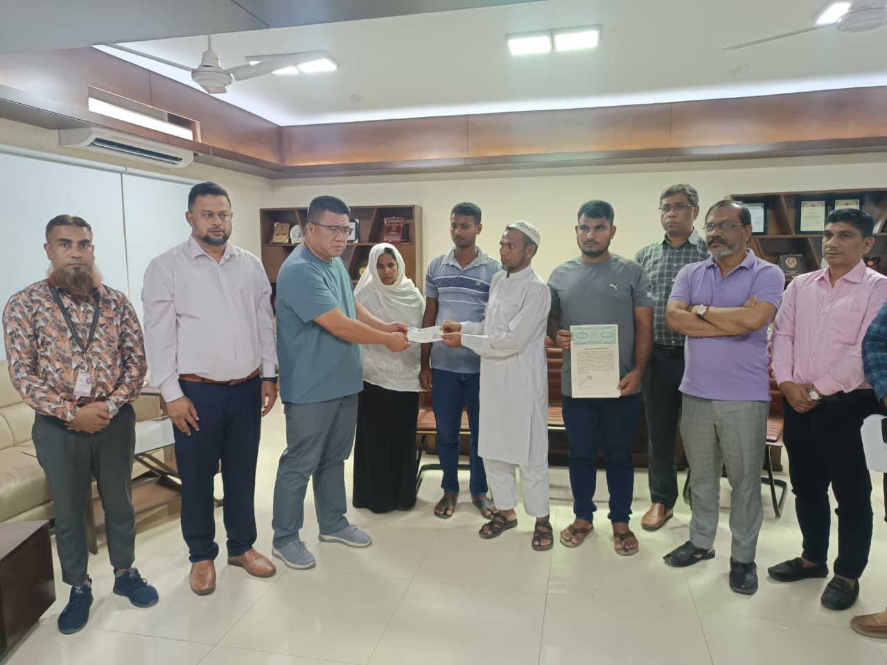বুধবার (২৪ সেপ্টেম্বর) দুপুরে হংকংভিত্তিক চীনা মালিকানাধীন প্রতিষ্ঠানটির চেয়ারম্যান মি. ফেলিক্স ওয়াই.সি. চ্যাং নিহতের পরিবারের হাতে ৫ লাখ টাকার চেক হস্তান্তর করেন। এর আগে প্রাথমিকভাবে ২ লাখ টাকা সহায়তা দেওয়া হয়েছিল। সব মিলিয়ে পরিবারটি মোট ৭ লাখ টাকা আর্থিক সহায়তা পেল।