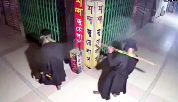 সিসি ক্যামেরায় দেখা গেছে, চোরচক্রের ২ জন সদস্য বোরকা পরে এসে জুয়েলারি দোকানটির শাটারের তালা কেটে বিপুল সোনা চুরি করে।